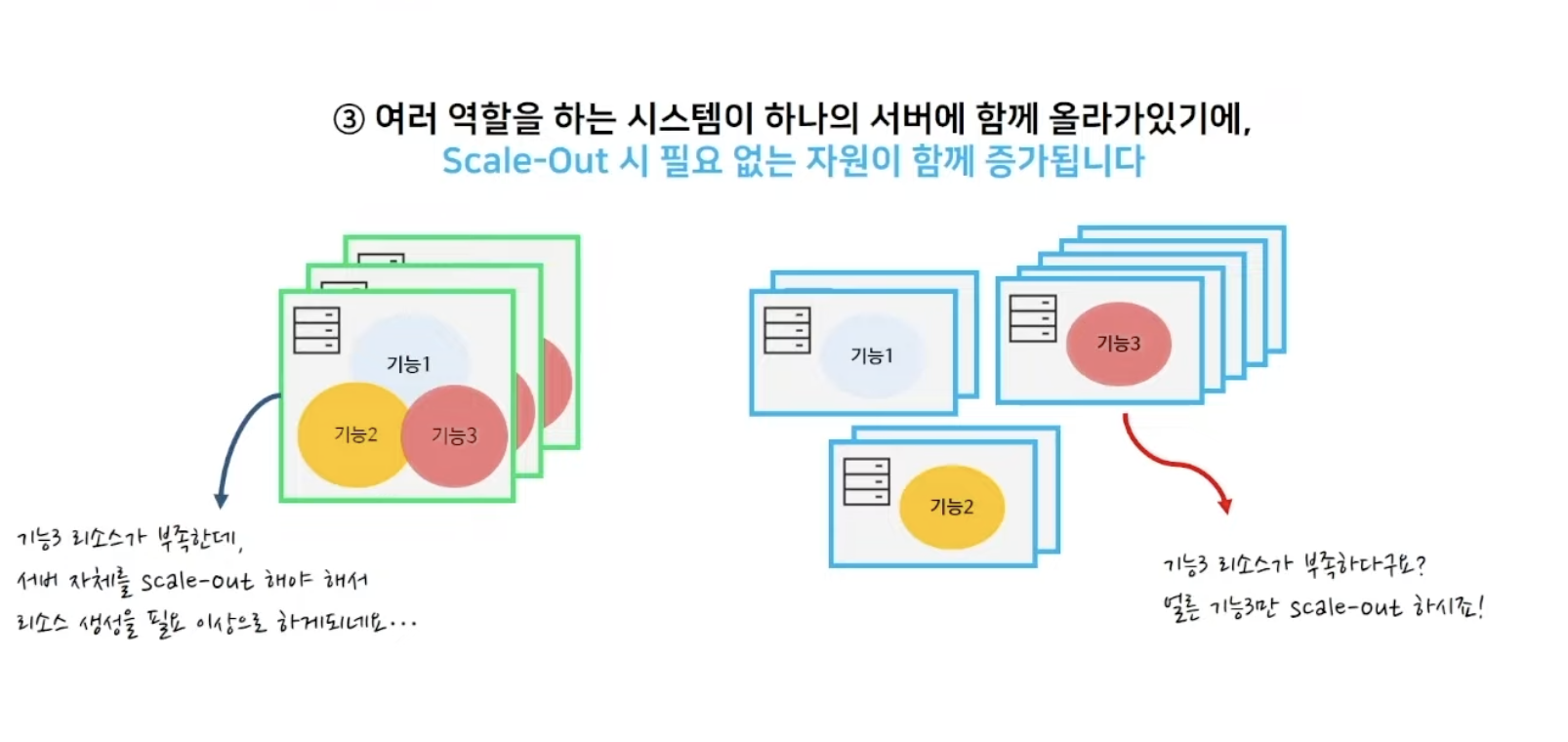 MSA는 기능 단위로 쪼개져있기 때문에 해당 부분만 scale -out 만 하면 된다 (부분 배포)