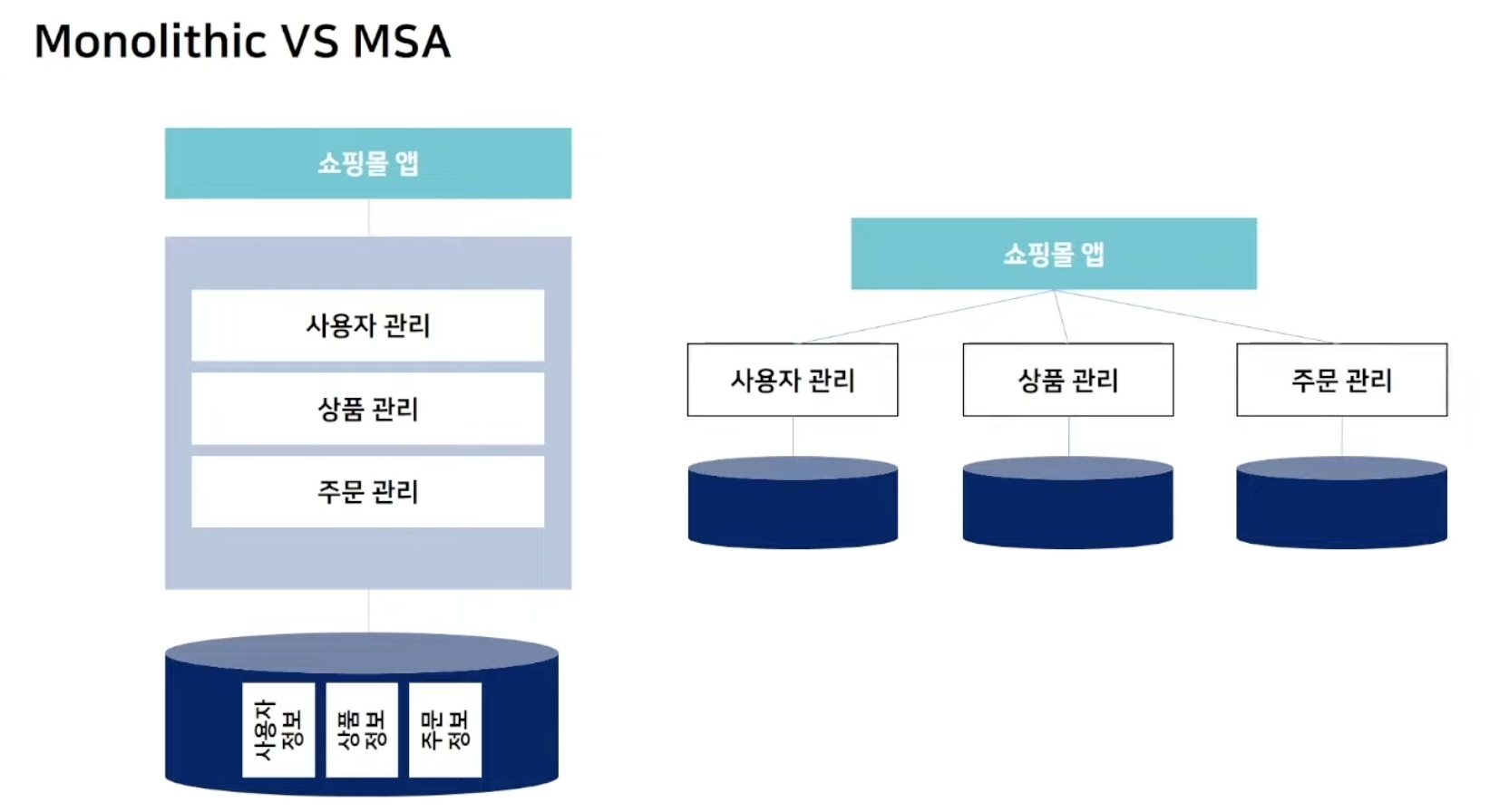 - 각각의 애플리케이션들이 서로 분리되어 있고 쪼개어져서 관리되고 각각의 데이터 베이스로 관리되고 있음