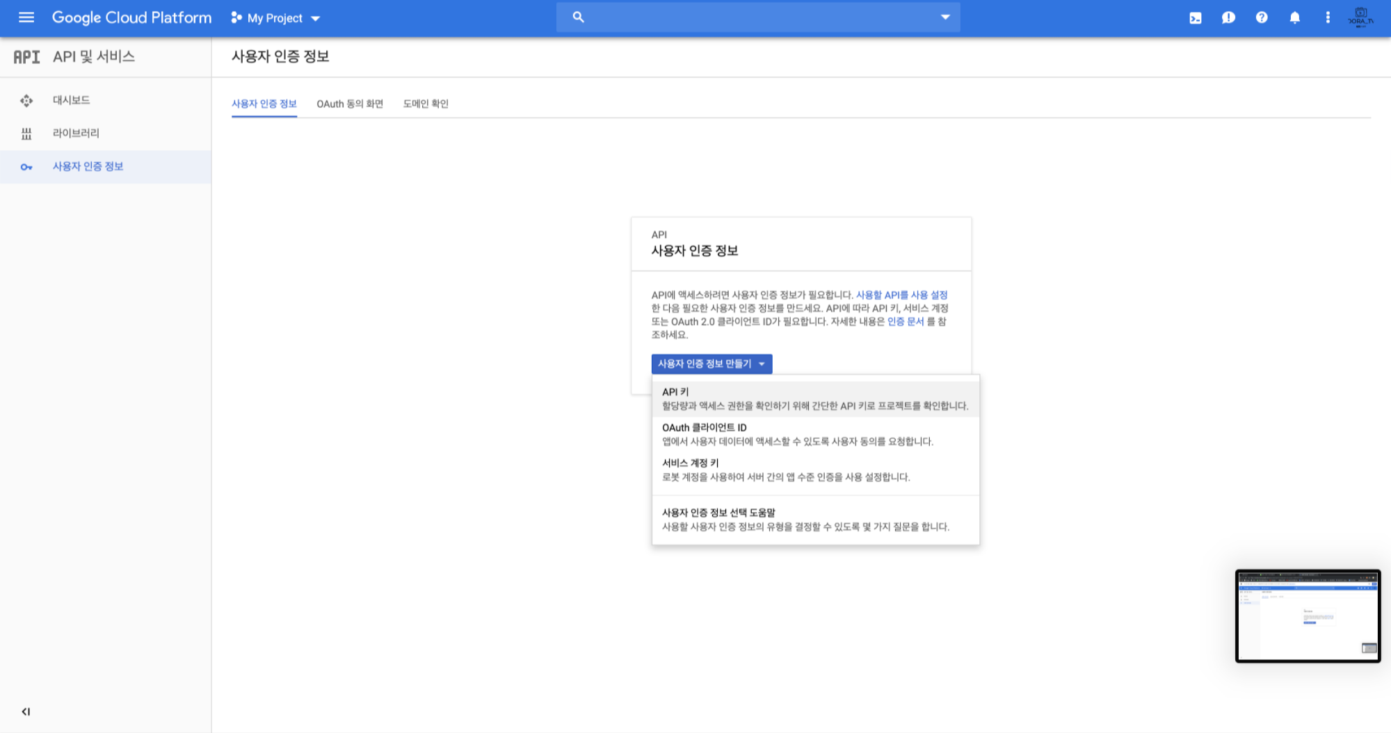 그럼 다음과 같은 화면이 나오는데 API키를 생성해 줍니다