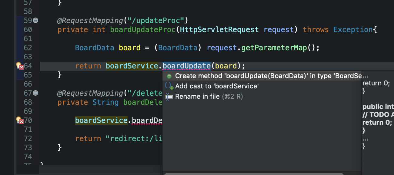 *에러 클릭후 create method 'boardUpdate(BoardData)'를 누르면 자동으로 메소드가 생성됩니다.